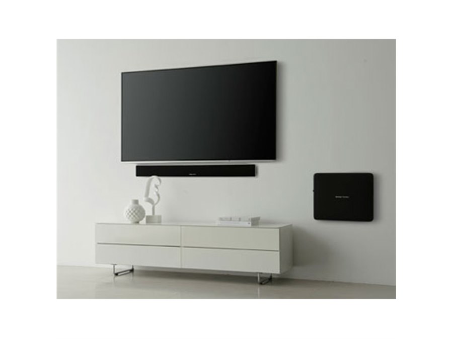 サウンドバーは厚さ32mmの超薄型で、質感の高いアルミボディを採用。高性能44mm径ドライバー+25mm径ドライバーを、内蔵アンプが総合140Wのハイパワーで出力する。ワイヤレスサブウーファーは厚さ86mmで、壁掛けや横置きに対応した。