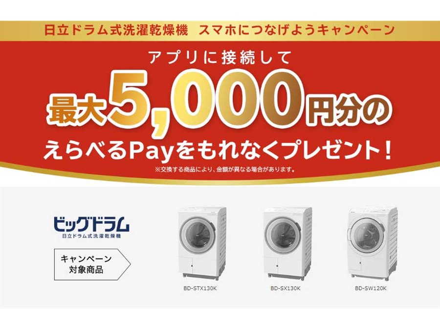 最大5,000円分還元の「日立ドラム式洗濯乾燥機 スマホにつなげようキャンペーン」