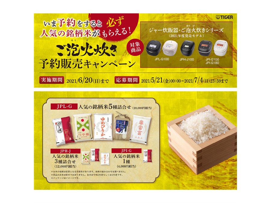 タイガー、最大2万円相当の銘柄米を贈呈する「ご泡火炊き」予約キャンペーン