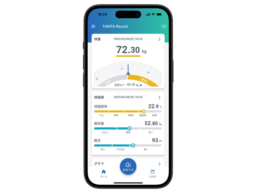 足腰の健康度がわかるタニタ独自の指標「脚点」を含む、8項目の計測したデータをスマートフォンアプリで管理できる体組成計。Bluetooth通信でスマートフォンアプリ「TANITA Record」および「ヘルスプラネット」と連携し、データ管理を行う。
