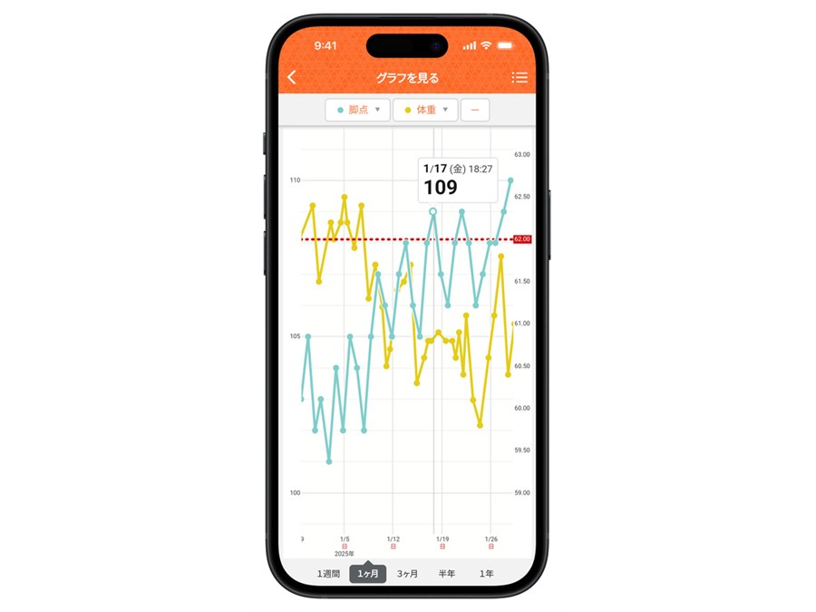 「脚点」は、体重に占める脚の筋肉量の割合が、理想とされる値と比べてどの程度なのかを点数で表示するというもの(50〜79ptは「低い」、80〜89ptは「やや低い」、90〜150ptは「良い」)。計測項目は、「脚点」のほか、「体重」「体脂肪率」「BMI」「筋肉量」「内臓脂肪レベル」「基礎代謝量」「体内年齢」を加えた、8項目を採用する。