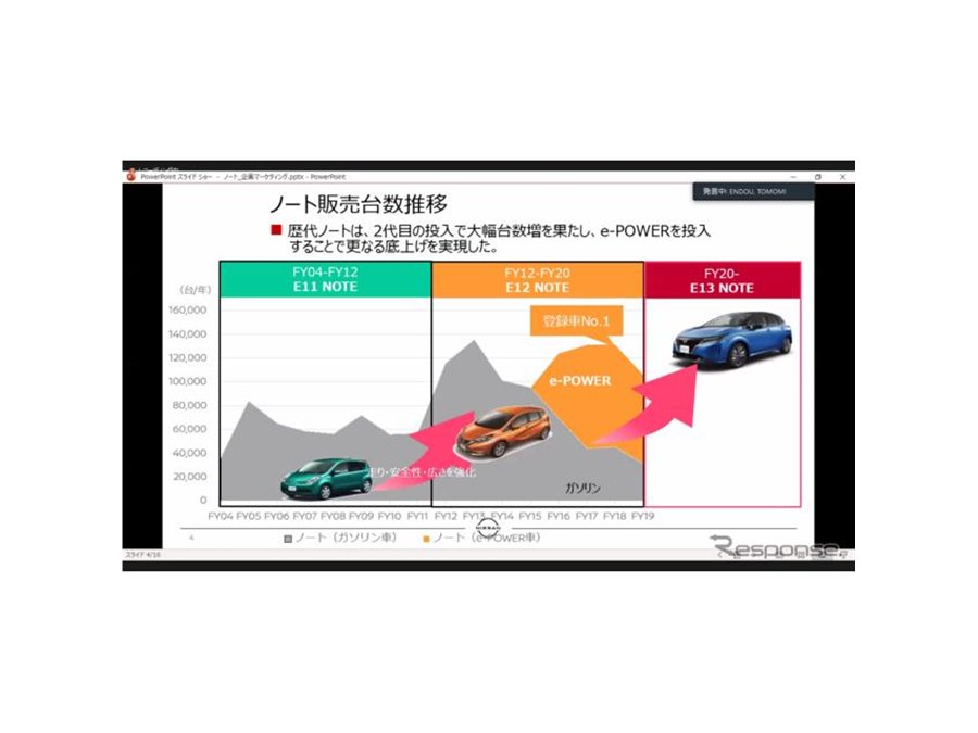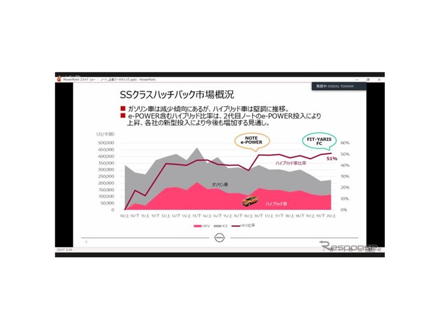 日産商品企画部日本商品グループ主管の遠藤智実氏によると、ノートが属する市場状況は、「ハイブリッドと呼ばれる電動パワートレインが非常に伸びており、また昨今CO2絡みの話題が色々なところで起きてきていることから、今後はさらに伸びていくと予測」。その中でノートは、2代目の途中でe-POWERを投入し、「とても好評で、登録車としてもナンバーワンを獲得した」と振り返る。