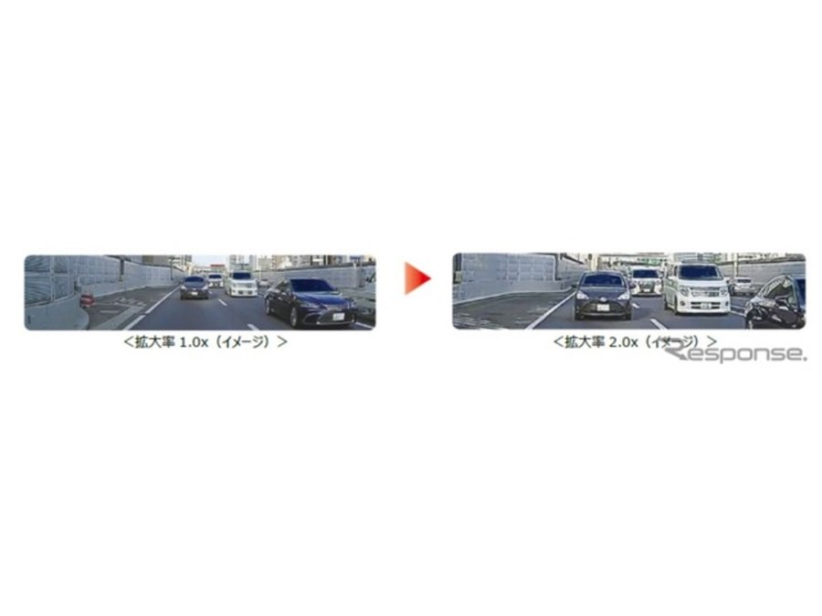ルームミラーモニターに表示するリアカメラの映像は、最大2倍・6段階で拡大できる「表示画角調整機能」を搭載。後続車との距離感をつかみやすくするために、広角レンズによる遠近感の違和感を調整することができる。