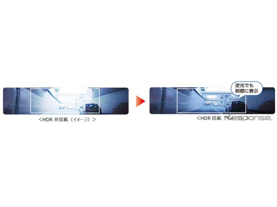リアカメラはハイフレームレート59fpsに対応し、鮮明で滑らかな高精細映像を実現している。明るく低ノイズで、色再現性に優れた裏面照射型CMOSセンサー「PureCel Plus-S」を新たに採用している。夜間やトンネル内など暗いシーンでは明るくノイズの少ない映像で表示し、明るいシーンでは色再現性に優れた映像の表示が可能になっている。