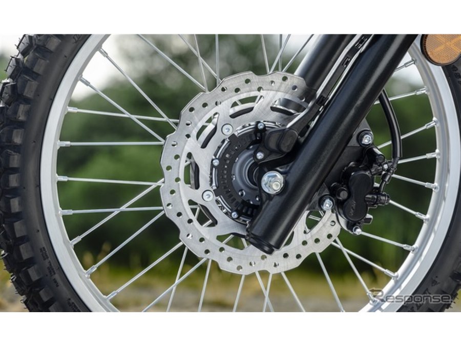フロントブレーキは直径267mmディスクローターと2ポッドキャリパー、リアは直径220mmディスクローターとシングルポッドキャリパーを組み合わせている。いずれも、パッド材質など摩擦系と、レバー比などの入力系との相互バランスを整えており、オフロードからオンロードまでさまざまなシーンで、コントロール性に優れた制動力を発揮。なおフロントブレーキにはABSを装備している。