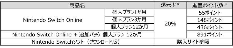 「eximo」「ahamo」「ギガホ」を契約のユーザーを対象に、ドコモの任天堂ソフトウェア購入サイトから、「Nintendo Switch Online」の利用券を購入した場合は利用券の販売価格(税別)の20%のdポイント(期間・用途限定)を、ゲームソフトを購入した場合は最大15%のdポイント(期間・用途限定)が進呈される。