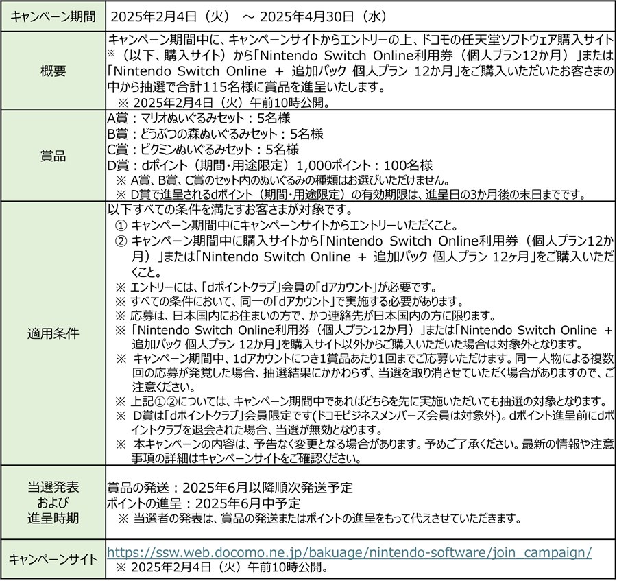 また、「『爆アゲ Nintendo Switch Online』 開始記念キャンペーン」を2月4日から4月30日までの期間で開催。ぬいぐるみセットや1000ポイントのdポイントが抽選で合計115名にプレゼントされる。