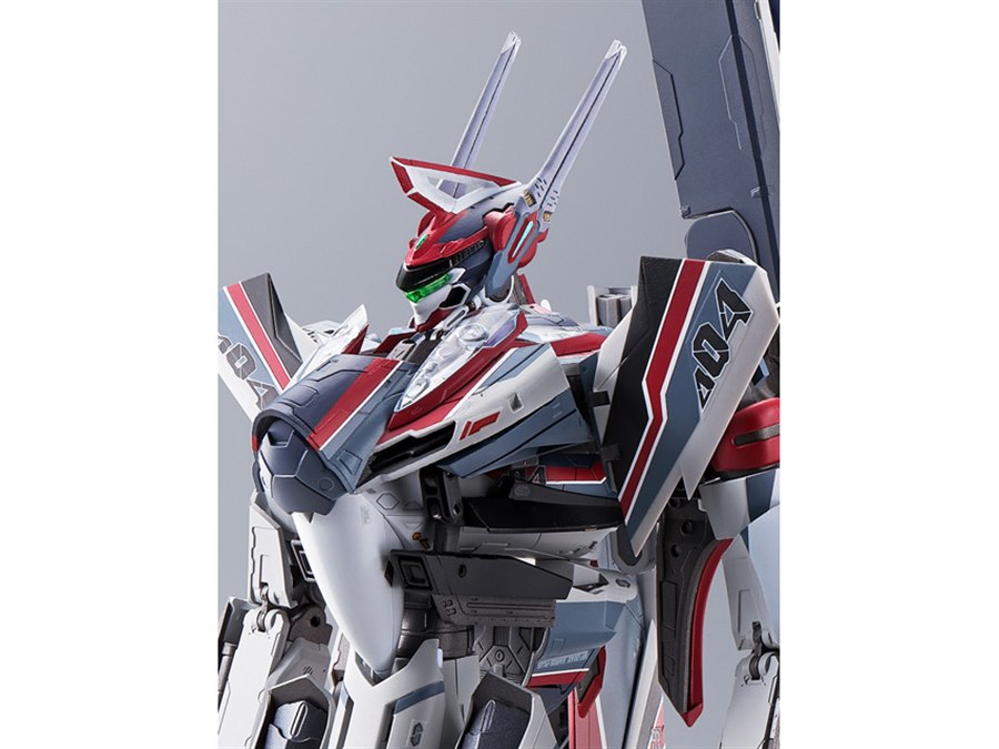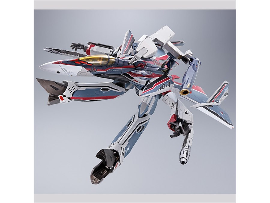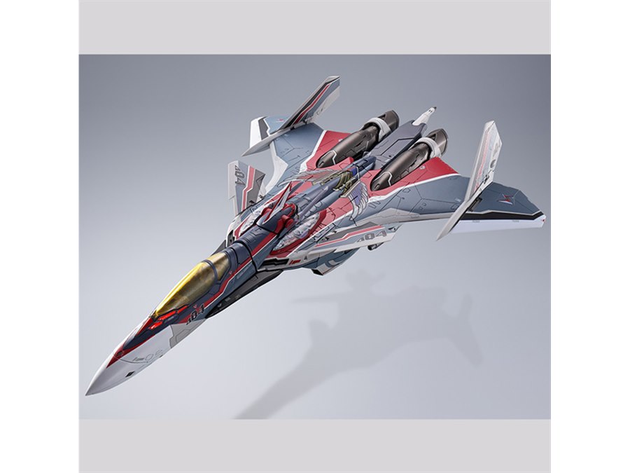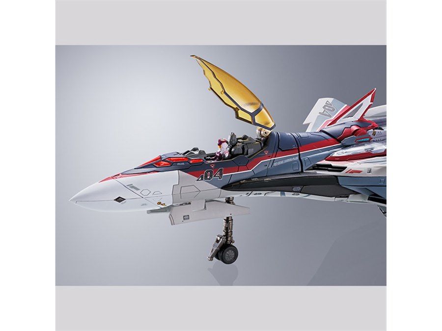 「劇場版マクロスΔ絶対LIVE!!!!!!」より、ミラージュ機がDX超合金に登場。赤紫で彩った機体には、上面にパーソナルマーキングを採用。本体に搭乗できるパイロットフィギュアも付属する。