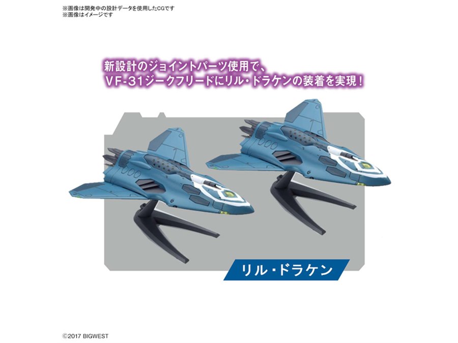 「マクロスΔ」より、ジークフリードにリル・ドラケンを付属したスペシャルパックが登場。新設計のジョイントパーツで、リル・ドラケンを装着できる。