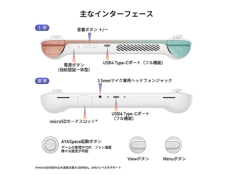 無線通信は、Wi-Fi 6準拠の無線LANとBluetooth 5.2に対応。インターフェイスとして、USB4 Type-C×2、microSDメモリーカードスロット×1、ヘッドホン×1を装備する。