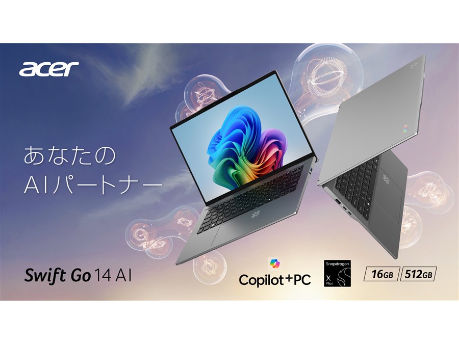 日本エイサーは、14.5型ノートパソコン「Swift Go 14 AI」を発表した。ラインアップとして、「SFG14-01-A56Y」「SFG14-01-A56YA」の2機種を用意。「SFG14-01-A56Y」を本日11月7日より、ヨドバシカメラ、ビックカメラグループおよびAcer公式オンラインストアにて発売し、「SFG14-01-A56YA」をAmazonにて順次発売する。