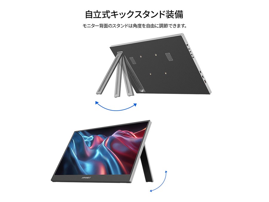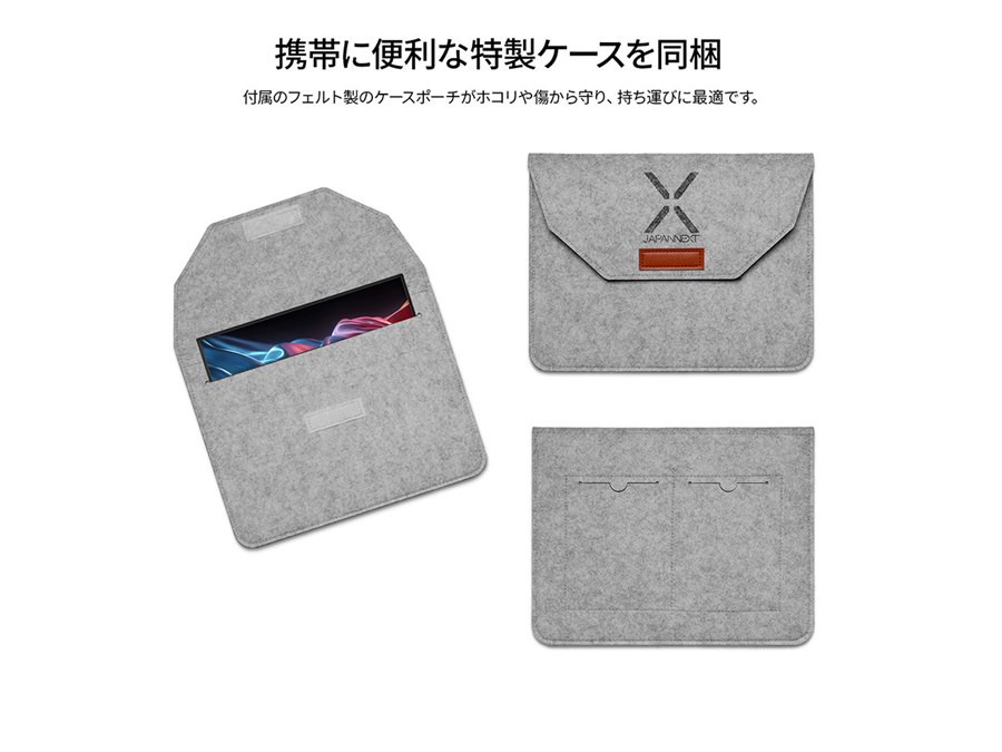 背面にはキックスタンドを搭載し、単体で自立使用が可能。フェルトケースを同梱しており、携帯時には本体をホコリや傷から守れる。1W+1Wのステレオスピーカーを内蔵するほか、モニターアームなどにも使用できる75×75mmのVESA規格に対応する。