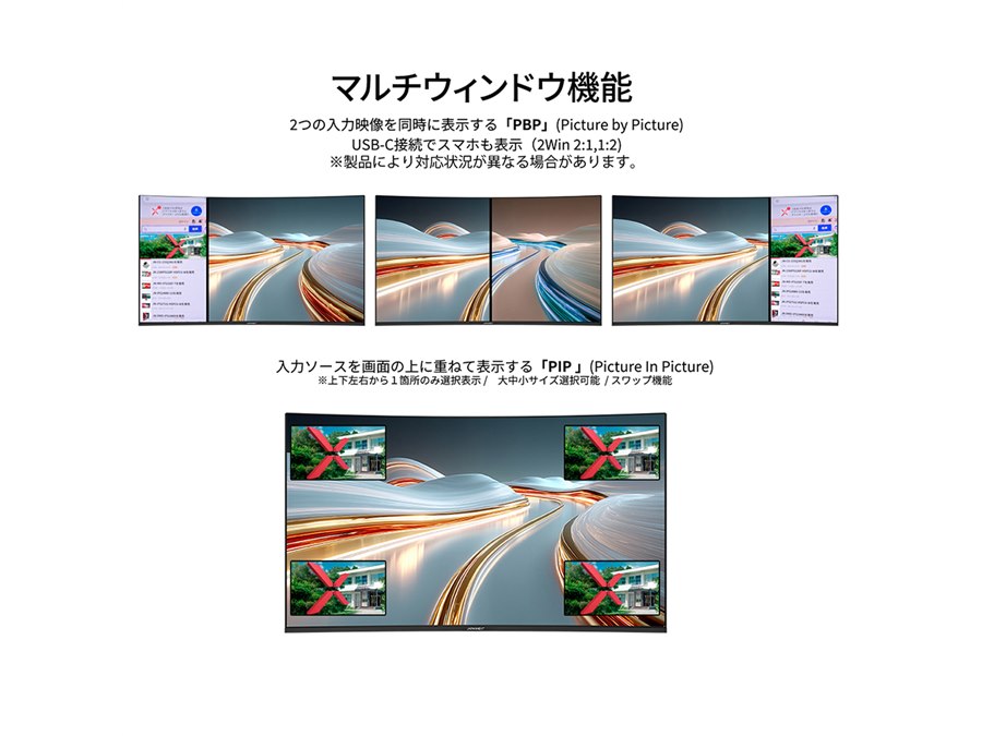 機能面では、複数の入力を同時に表示する「PBP(Picture by Picture)」や、入力の1つを子画面で表示する「PIP(Picture in Picture)」に対応。KVM機能も搭載する。