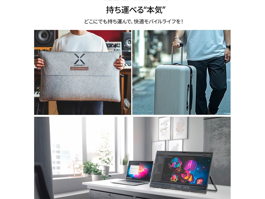 一般的なモバイルモニターの15.6型を上回る23.8型の画面サイズと、高い携帯性を両立したのが特徴。出張先やテレワーク環境で、デスクトップ用のディスプレイと近い作業領域が確保できるという。
