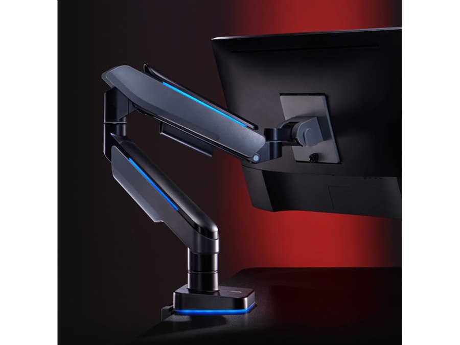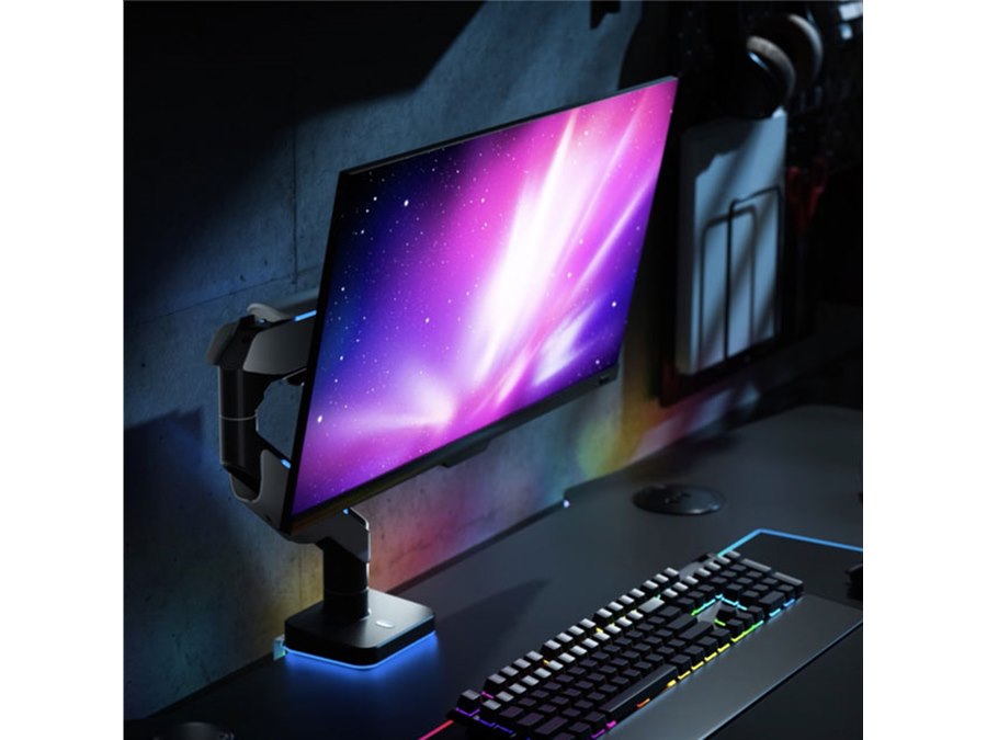 RGBライティング機能を搭載したモニターアーム。土台部分の電源ボタンを押すと、アーム内部に搭載したLEDが点灯する。ボタンを押すごとに、6種類の単色パターンと、14種類のグラデーションパターンの切り替えが可能。ボタンを2回押すと、ランダムモードに切り替わる。