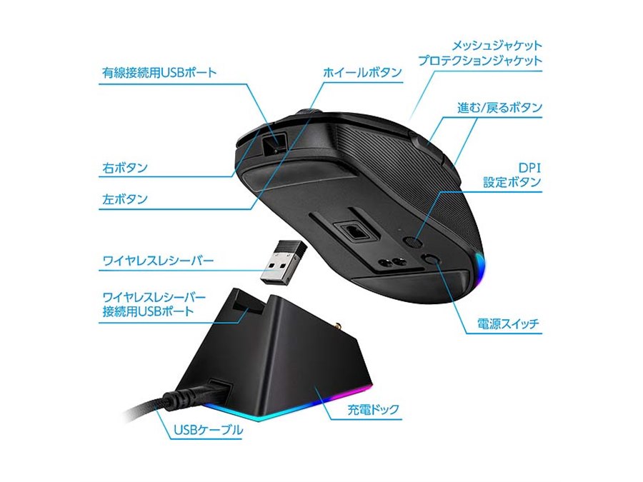 このほか、ボタン数は5個。付属の充電ドックでワイヤレス充電が可能なほか、USBケーブルによる有線接続にも対応する。バッテリー駆動時間(ポーリングレート1000Hz使用)は、LED発光時が約15時間、LED消灯時が約60時間。