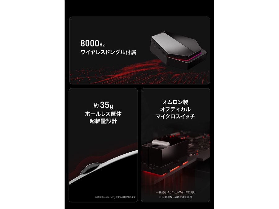 また、ワイヤレスドングルが付属しており、有線・無線ともに最大8000Hzの高ポーリングレートに対応。オムロン製オプティカルマイクロスイッチを採用し、高い反応速度と耐久性を実現している。