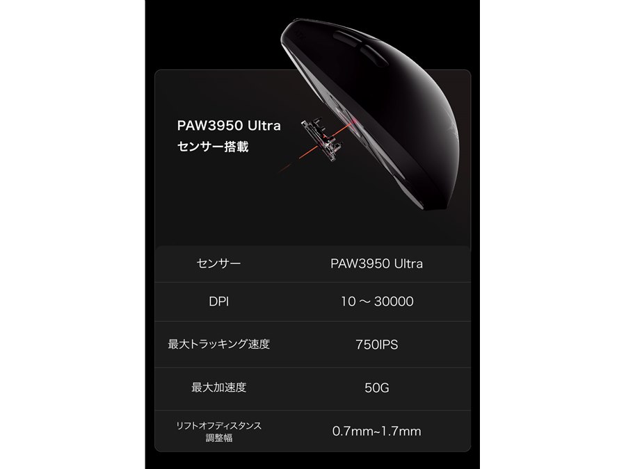 穴のない滑らかで握りやすいフォルムを採用しながら、約35gという軽量ワイヤレスゲーミングマウス。読み取りセンサーには「PAW3950 Ultra」を搭載しており、解像度10〜30000dpi(42000dpiまでオーバークロック可能)をサポートする。