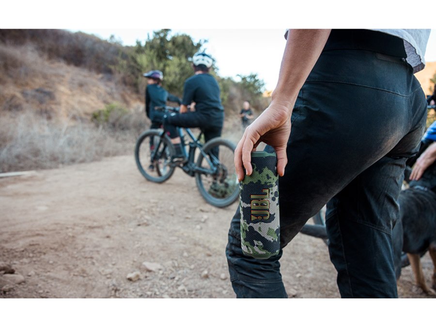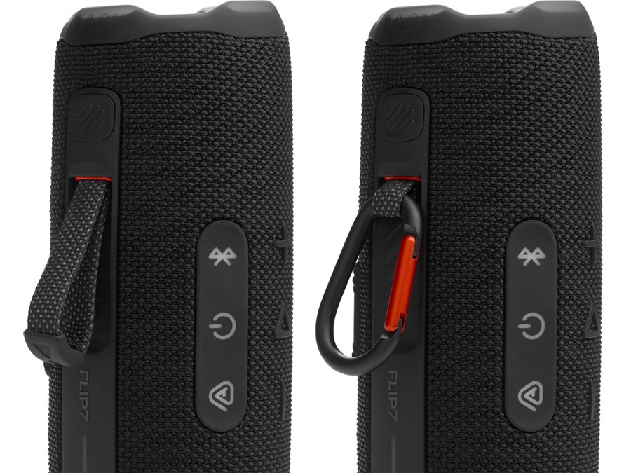 「Flip 7」は、500mlペットボトルサイズのスリムなBluetoothスピーカー「Flip」シリーズの最新モデル。本体の防塵・防水性能が「Flip 6」のIP67からIP68へと強化されたほか、「PushLockシステム」と呼ばれる独自のストラップ機構を採用し、付属のカラビナやストラップをワンプッシュで取り付け・交換できるようになった。