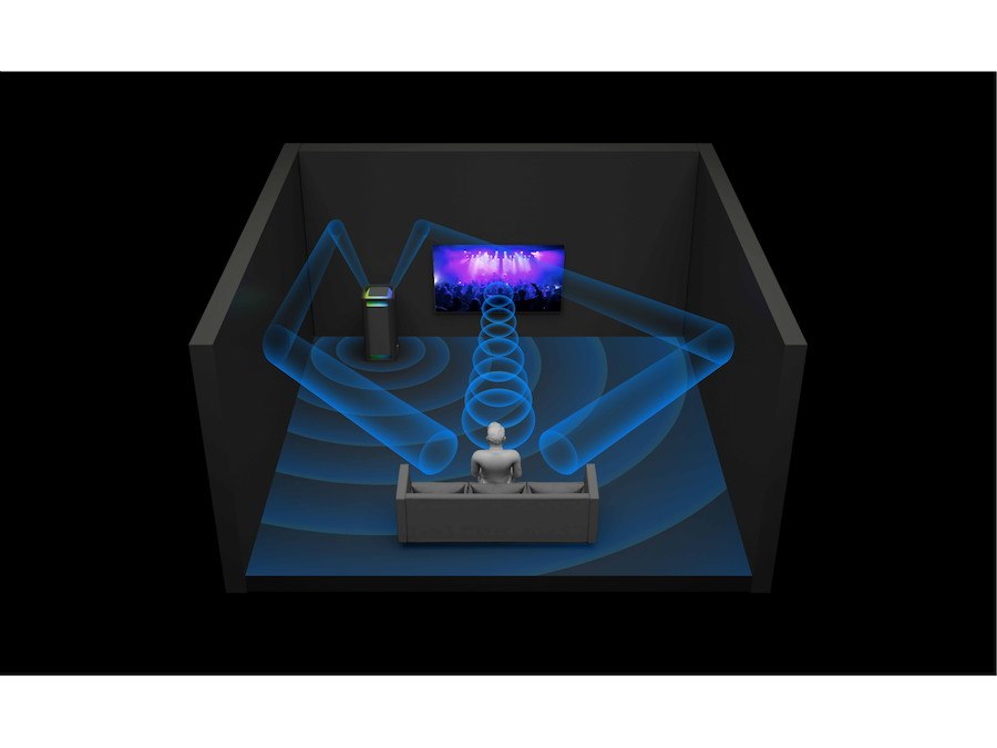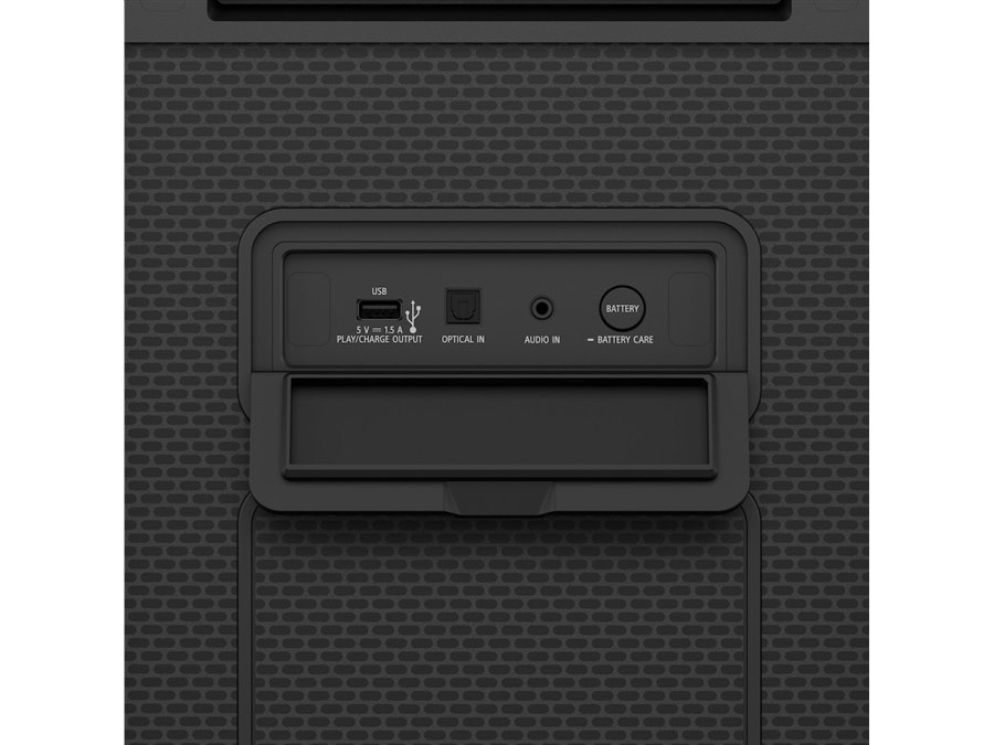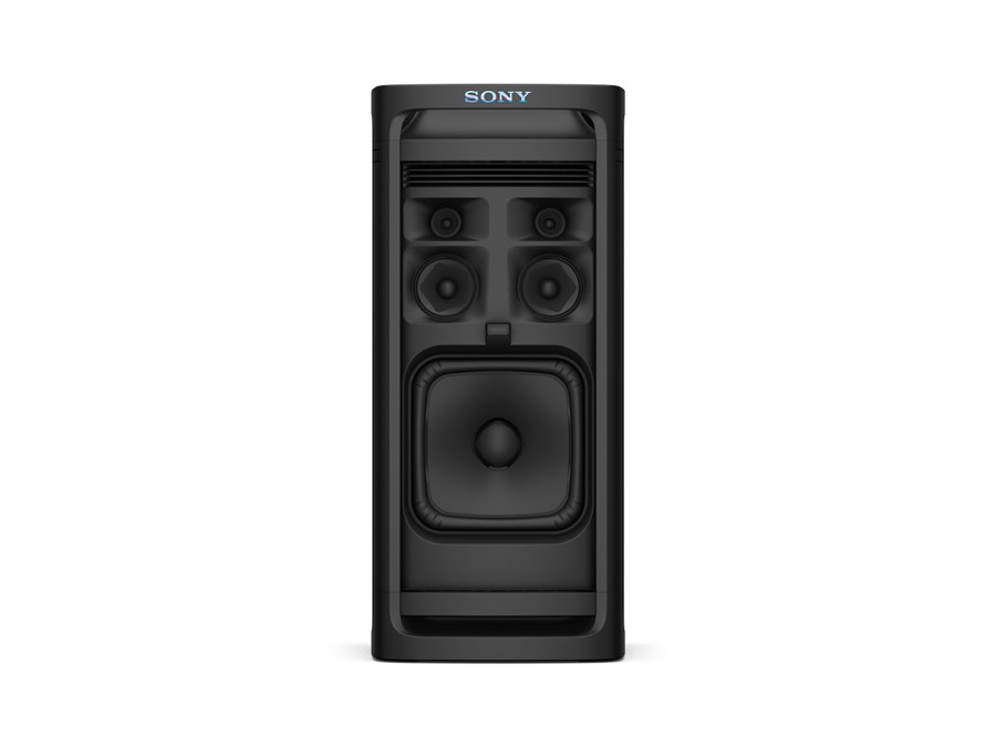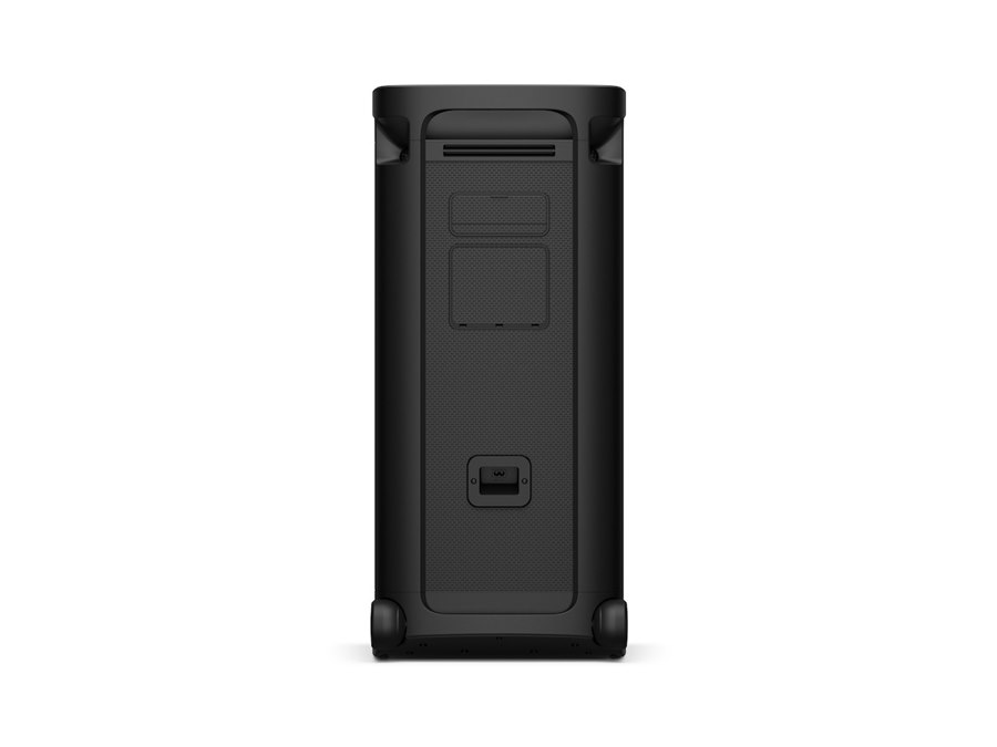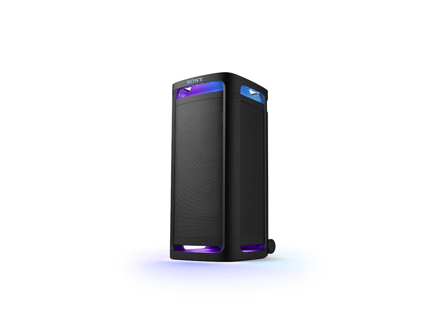 本体は天面防滴仕様で、移動や持ち出し時に便利なキャリーホイールやハンドルも用意。本体上部と下部には、音楽に合わせて光るライティング機能「360° パーティーライト」も搭載している。本体サイズは410(幅)×910(高さ)×456(奥行)mm、重量は約29.6kg。カラーバリエーションはブラックのみ。