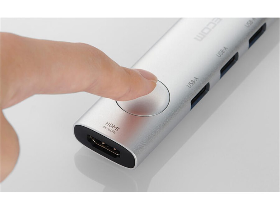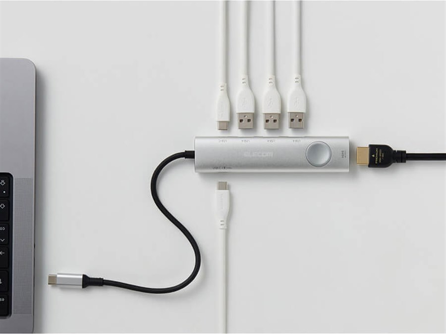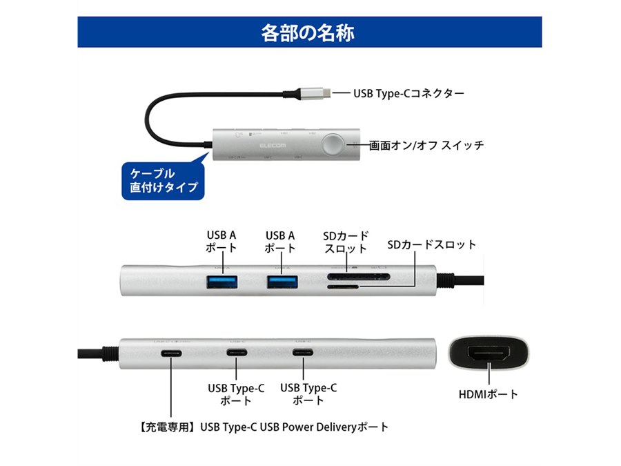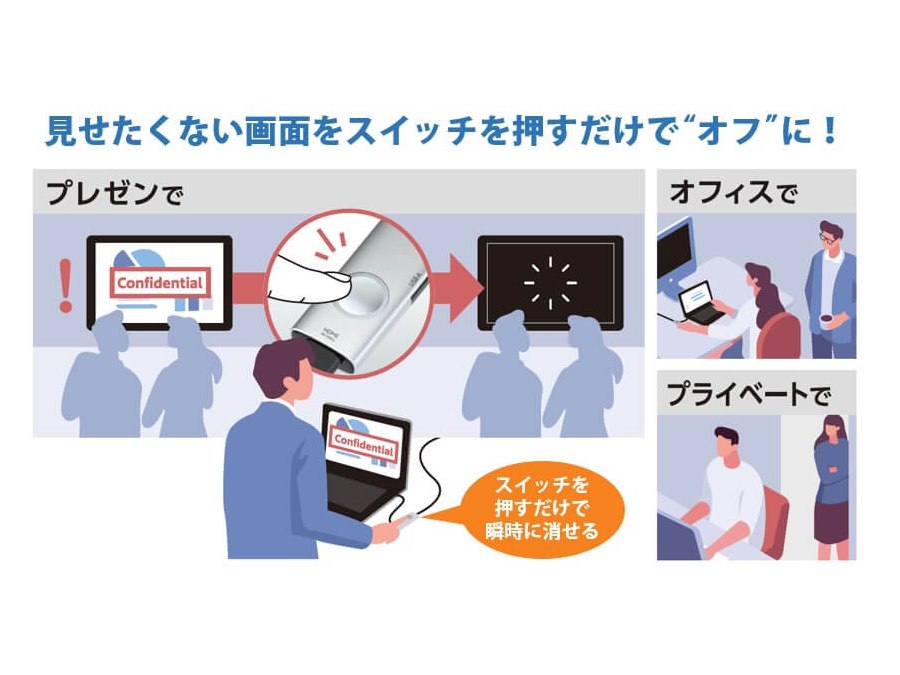 いずれも、ノートパソコンとのUSB 3.1 Gen1 Type-C(5Gbps)接続に対応したドッキングステーション。HDMI出力端子から外部ディスプレイに表示した画面を、ケーブルを抜き挿しせずに、画面を消したり、付けたりできるスイッチを搭載するのが特徴だ。